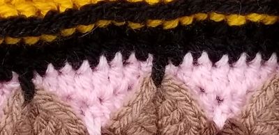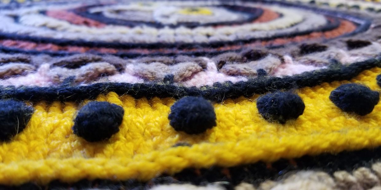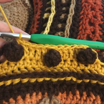 Here we are again, another installment of weekly crochet. This week is our final section in the round shape. We will be adding a bit of texture with a band of popcorns worked in the same colors as the eyes. This will draw the eye from the center out.
