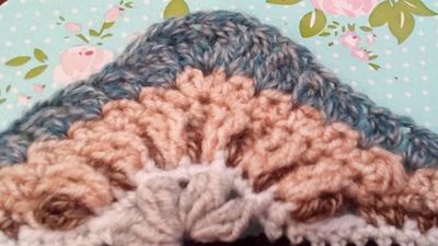 16 sc, 8 dcl, 5 trcl, 56 trc, 7 ch 3 p, 2 ch2, 10 ch1 ea side
