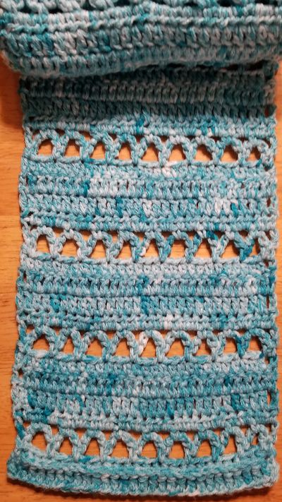 Sc in first st, ch5, sk 2 sts. [Sc in next st, ch5, sk 2 sts] 8 times. Sc in next 2 sts. Turn.
